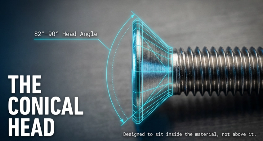 A countersunk fastener has a conical head that fits into a matching cone-shaped recess. When installed, the top of the head aligns with the material surface.